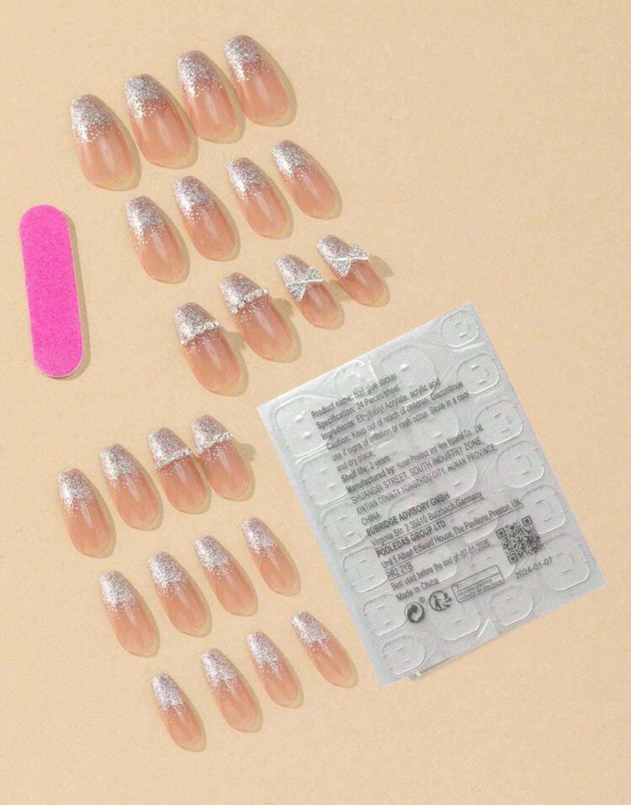 - 24 press-on nails with a glossy finish and 3D rhinestone bow design