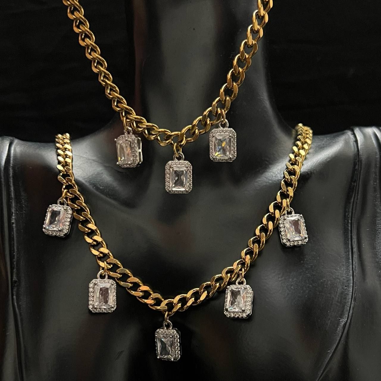 Elegant jewelry set made from pure 316 stainless steel, designed for durability and long-lasting shine. The set includes a stainless steel chain and bracelet with gold-plated pendants, decorated with zircon stones for a refined and luxurious look.