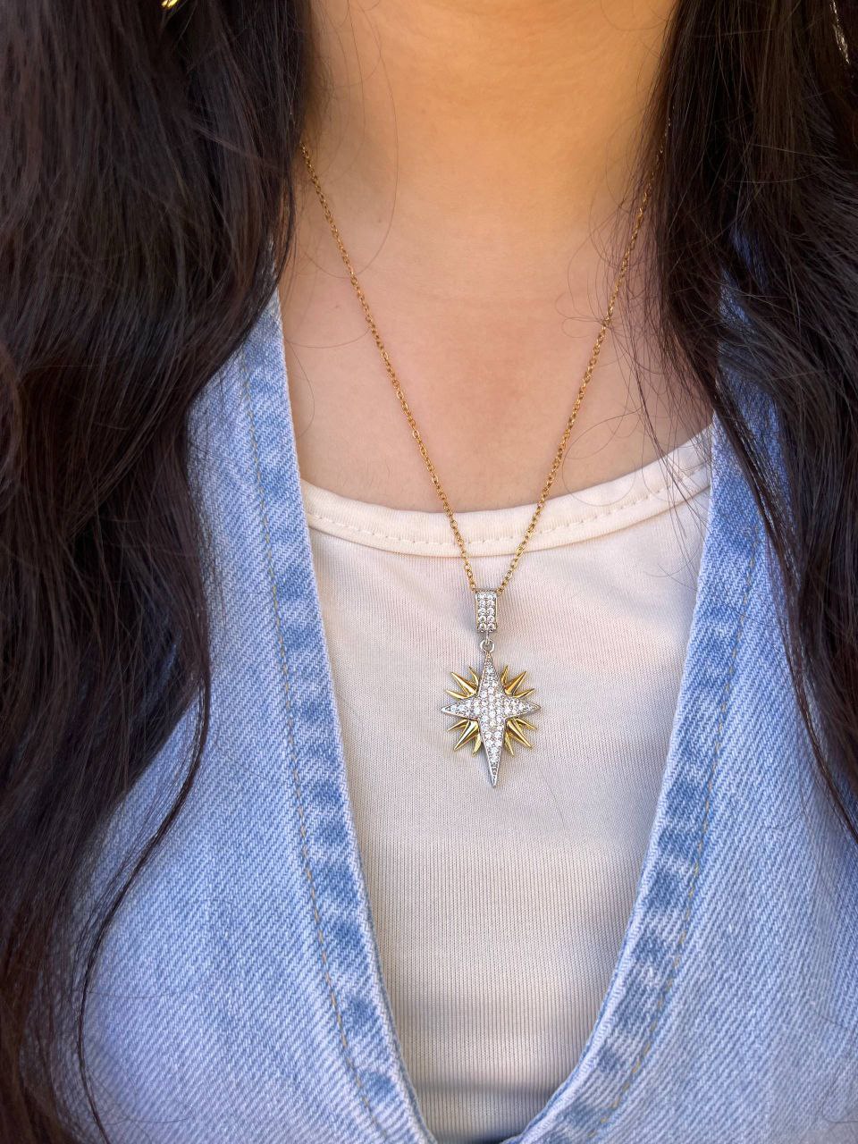 Elevate your style with this Stainless Steel 316 Necklace featuring a gold-plated pendant adorned with sparkling crystals.